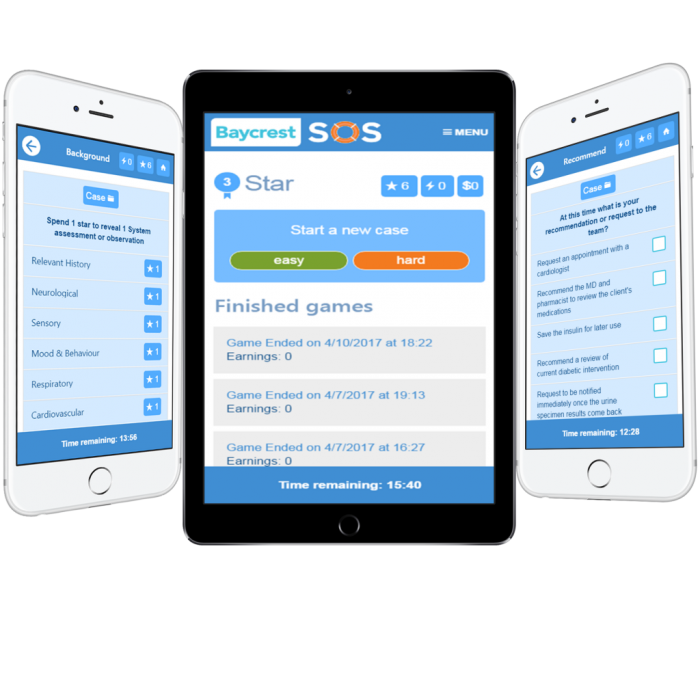 There is a crisis in seniors' care where patients are unnecessarily sent to emergency to the detriment of both the patient and healthcare system. This gamified app provides real life patient scenarios to reinforce and train hospital personnel.